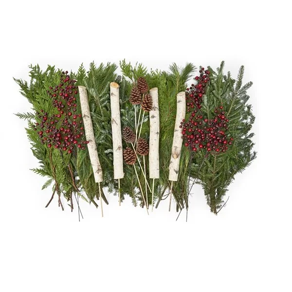 Carefully selected lush evergreen branches and boughs to DIY your very own outdoor urn arrangements. The winter greens used in these arrangements are: fresh cut Fraser fir, white pine and western cedar. With 3 large Ponderosa cones, and 3 faux berry implements plus a pair of 20-in birch poles. They elude a pleasant festive fragrance, warming the air with a brilliant aroma and filling your heart with joy this season.