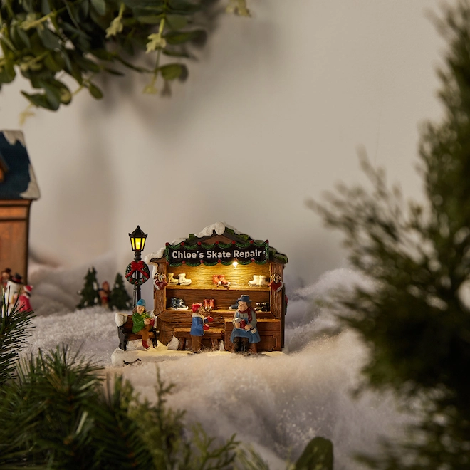 Chloe is repairing skates for all the little kids who want to enjoy the village ice rink! Add this Carole Town piece to your preexisting Christmas village. Two small LED lights illuminate skates and give this artwork a realistic look.