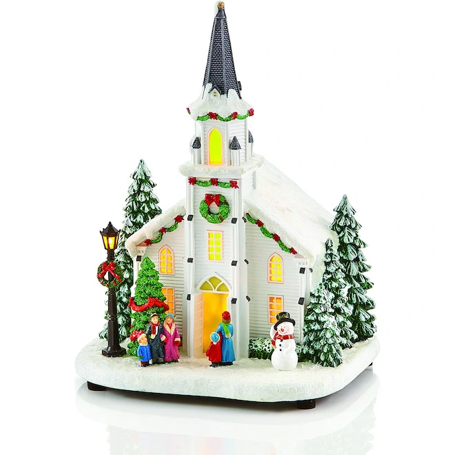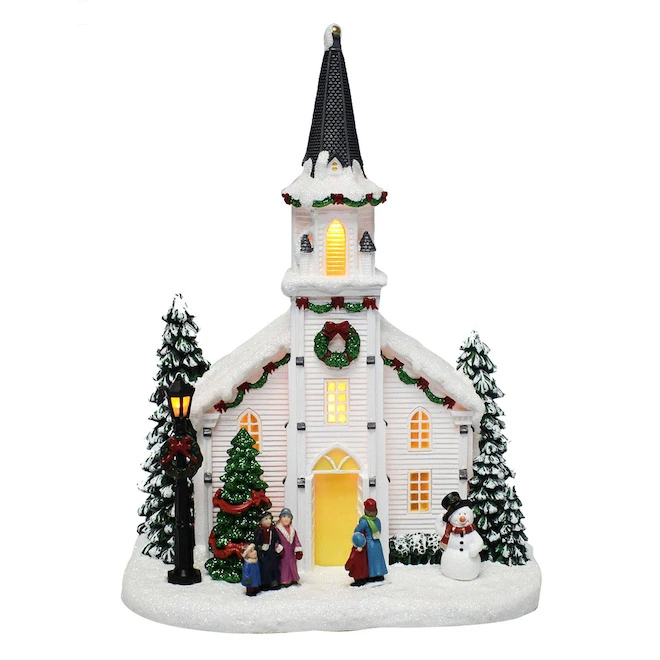 This traditional snowy landscape typical of the holiday season features a church welcoming the faithful for midnight mass. This pretty scene will perfectly complement your vintage Christmas village.