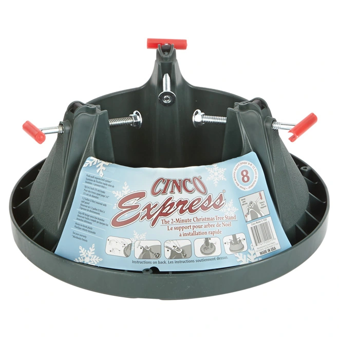 Set your Christmas tree up quickly and securely with this Cinco Christmas Tree Stand. The reservoir’s deep spill guard prevents over-filling and the low, wide design accommodates lower branches. The express bolt system uses a push-pull ratchet mechanism for quick and easy set-up and take down. Made of durable plastic with reinforced screw holes, this tree stand offers superior strength and stability. It fits real trees up to 8 feet tall with up to a 6 inch diameter trunk.