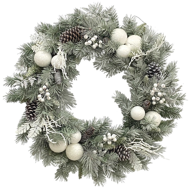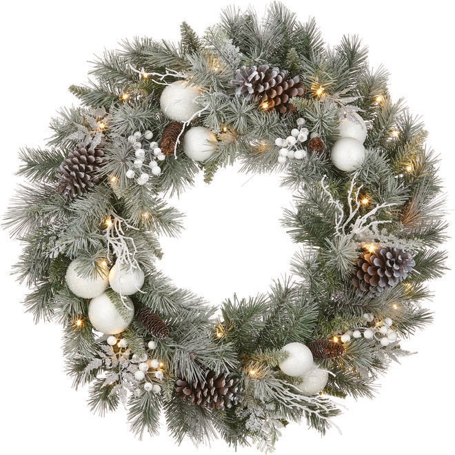 This strikingly beautiful Holiday Living 30-inch pre-lit wreath features contrasting white ornaments and berries, and silver tips. The white frosted leaves and sprigs give it a gorgeous wintery look while 35 warm white lights add to its brightness and charm.