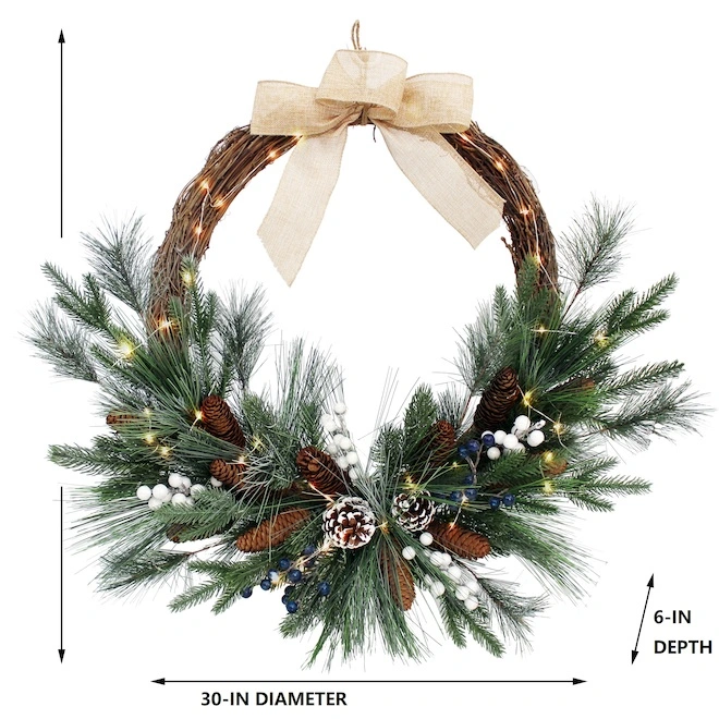 - 30-in pre-lit pinecone wreath with white and blue berries gives a festive look to your home’s holiday décor