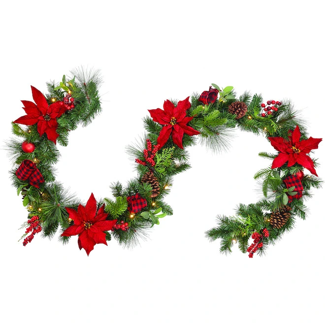 Holiday Living Indoor Pre-Lit 9-ft Poinsettia Christmas Garland With Warm White LED Lights